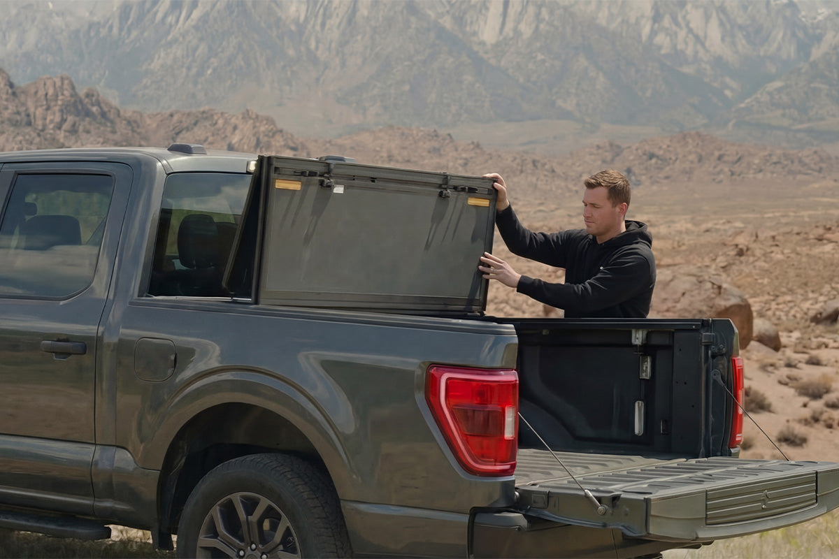 Open up fast. The tri-fold configuration allows easy partial or full access to your truck bed in seconds — ideal for on-the-go hauls, gear grabs, or roadside adjustments. Secure it in the 2/3 open position with reinforced nylon straps, or keep it fully closed for streamlined driving.